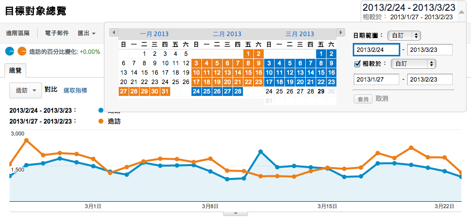 這個是 Google Analytics 最標準的流量圖, 從上圖的確是很難判斷這網站有沒有在成長? 而比較好的方式, 就是用區間做比較, 如下圖: